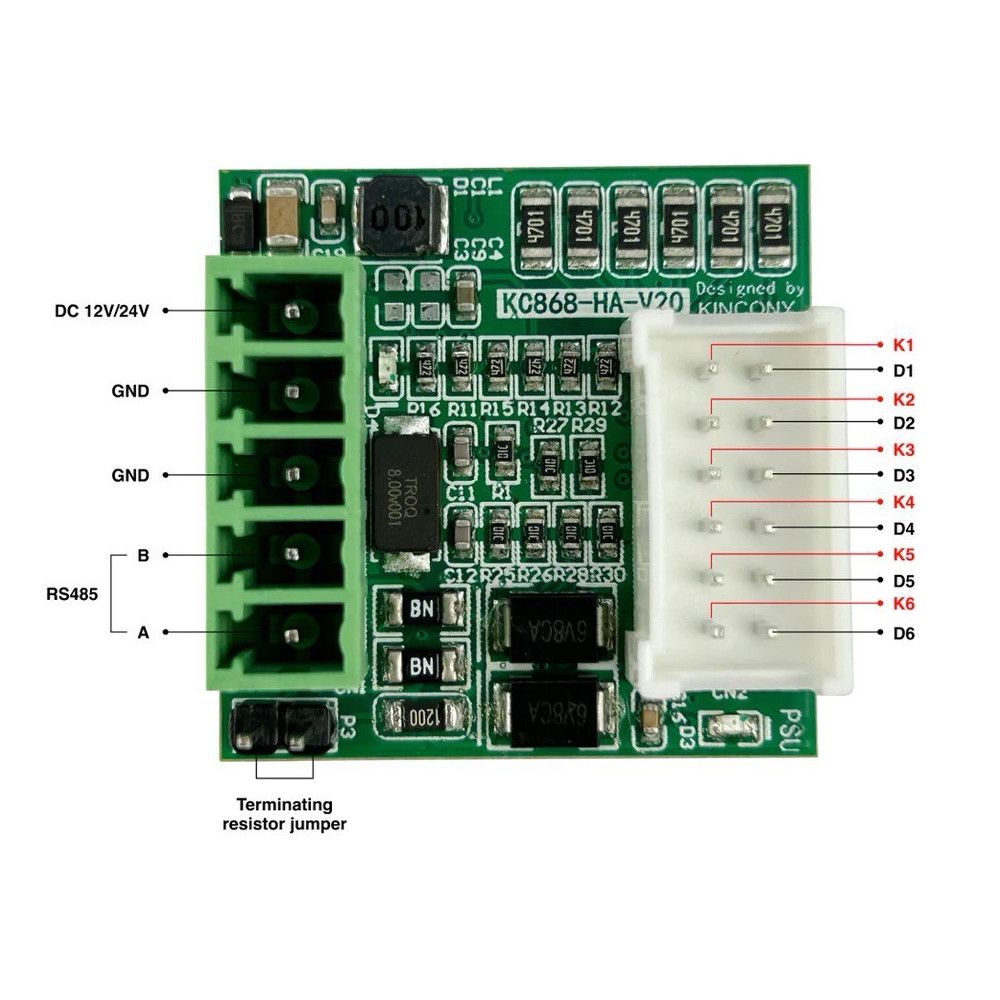 Nejmenší modul RS485 IO – modul KC868-HAv2.velikost 3cm*3cm.nechte svůj přepínací panel a suchý kontaktní senzor převést na RS485.KC868-HA RS485 INPUT & OUTPUT plugin pro ESPHome, snadno integrovatelný do domácího asistenta.K domácímu asistentovi můžete přidat desku KC868-HA se 6 digitálními vstupními porty a 6 digitálními výstupními porty pomocí RS485.